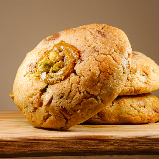 - Aventura de Pistacho y Sal Marina: Estas galletas son suaves, saladas y con un toque de elegancia. Las cargamos con pistachos verdes enteros, crujientes escamas de sal marina de Alicante y suave chocolate con leche Valrhona Equatoriale. ¡Es el dulce-salado que querrás una y otra vez!